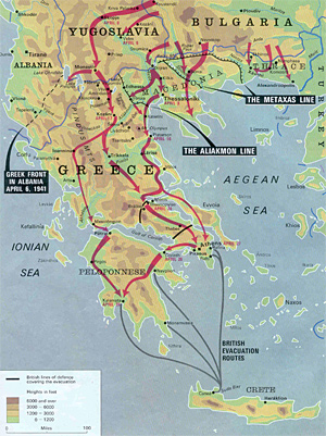 Greek King George II and his Government depart for Crete. Commander-in-Chief Alexandros Papagos resigns.