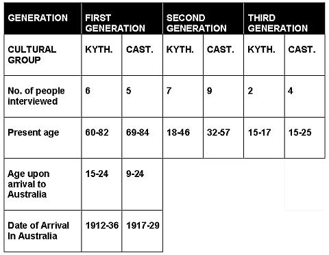 that of other historical sources...searching for internal consistency, cross-checking details from other sources, weighing evidence against a wider context are just the same as for other sources. All are fallible and subject to bias. (40) With these points about oral history methodology kept in mind, thirty-three history interviews were conducted of the first , second and third generation of Kytherian and Castellorizan Greeks.